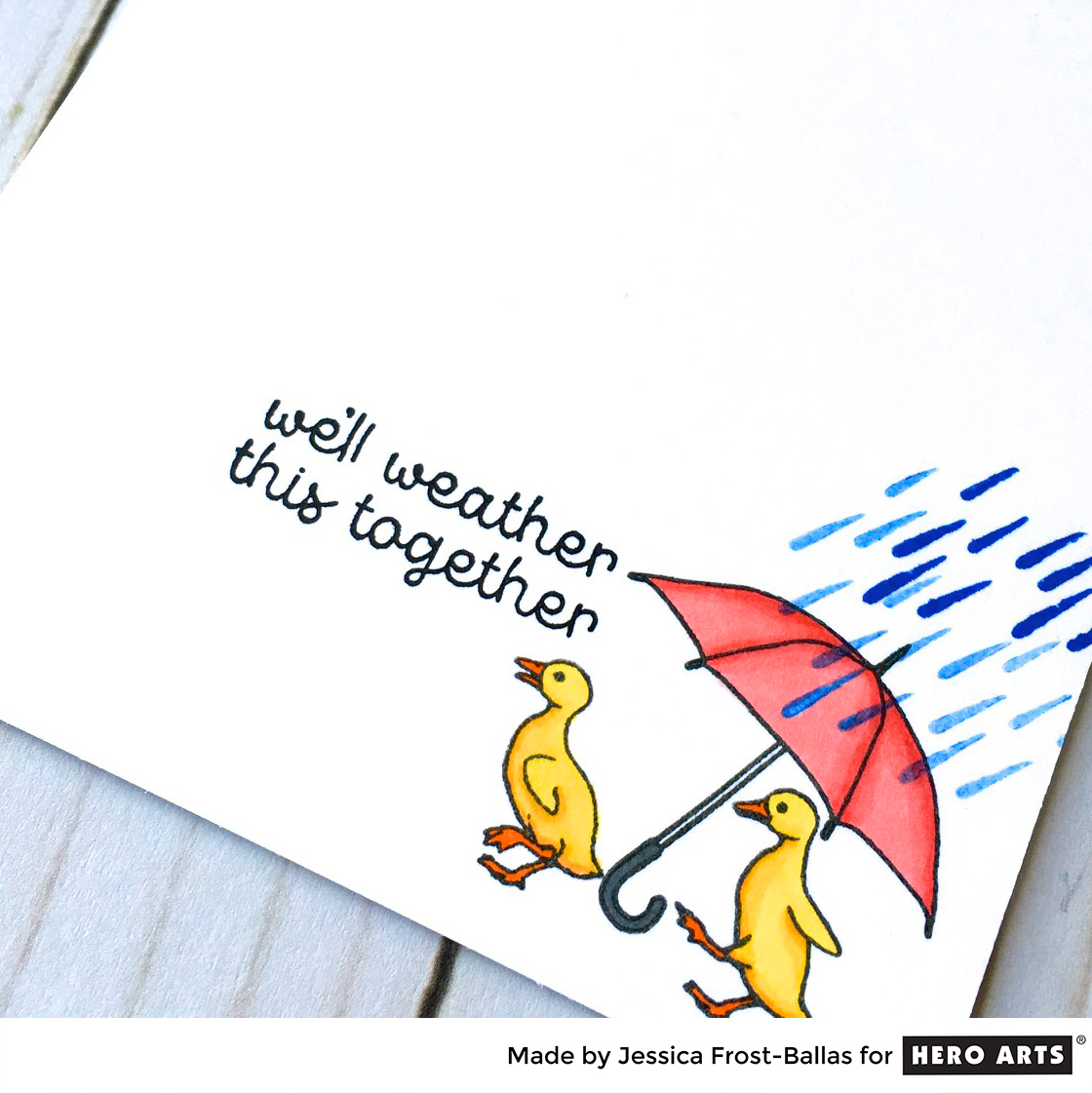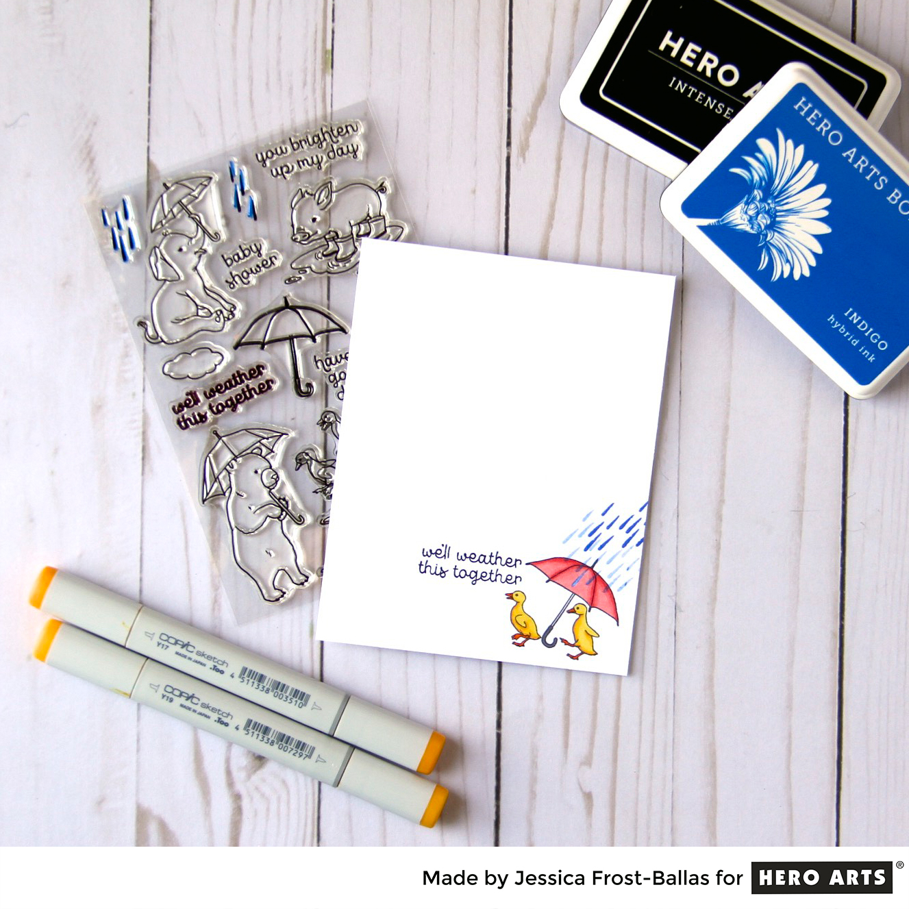 Aren’t those duckies adorable!!??!! I stamped them and the umbrella and colored them with copic markers. I stamped the sentiment with intense black ink and then stamped the raindrops from Fun in the Rain. I used indigo hybrid ink and used generation stamping to get the two different shades of blue.
