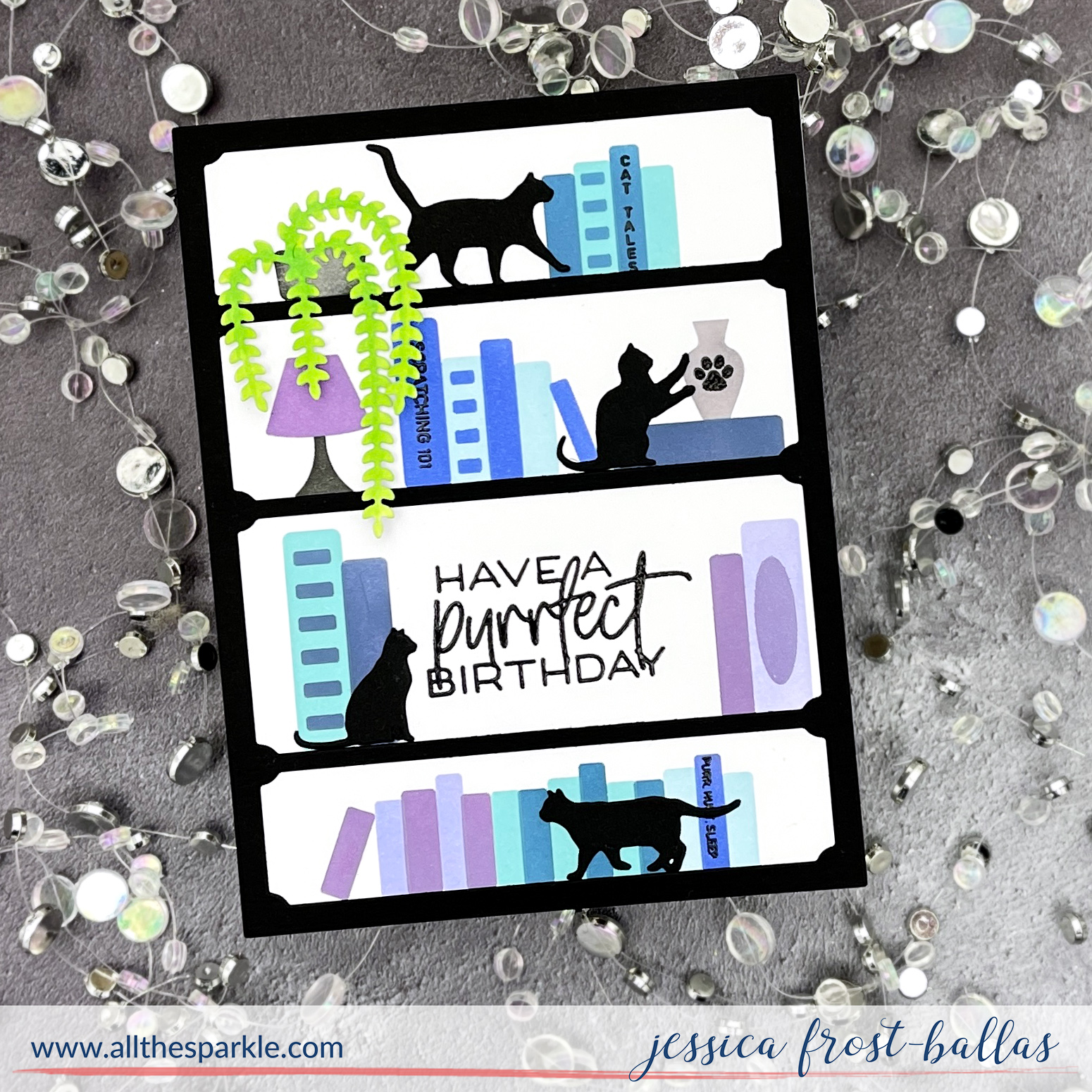 Today I’m sharing a card using one of the new Simple Shelves die, the adorable kitty silhouettes, and the Simple Shelves stencils! I used distress oxide inks in teals, blues, and purples to blend over the book stencils and then added some titles and accents with the stamp set. I also added a sentiment from Purrfect Sentiments, the cute plant from Shelf Add-ons, and finished the card with a few kitties from Catitude dies!