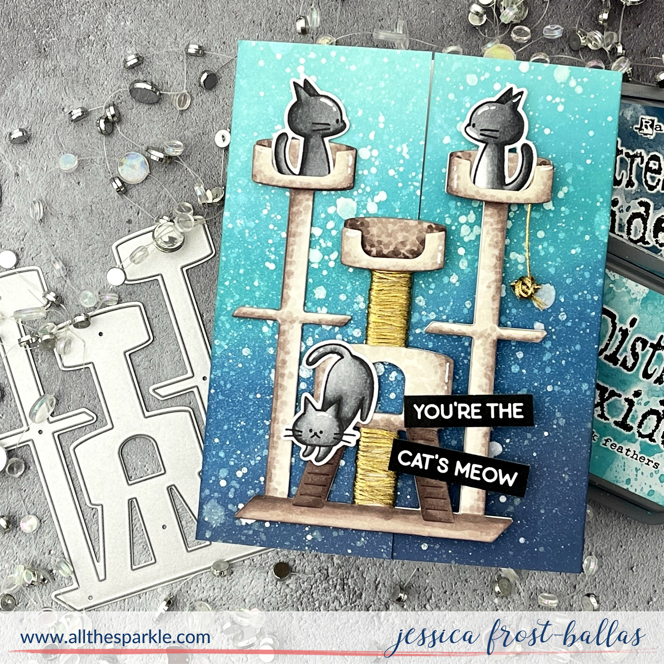 Earlier this month I created a video for the Sneak Peek Club using the Cat Tree House die and wanted to share it here, too! I blended salvaged patina, peacock feathers, and uncharted mariner distress oxide ink to create the background and splattered it with water, shimmer spray, and white gouache. Then I colored the cat tree with copics and added the gold thread around the posts to resemble the scratching posts on a cat tree. Finally I added a few kitties from A Little Help