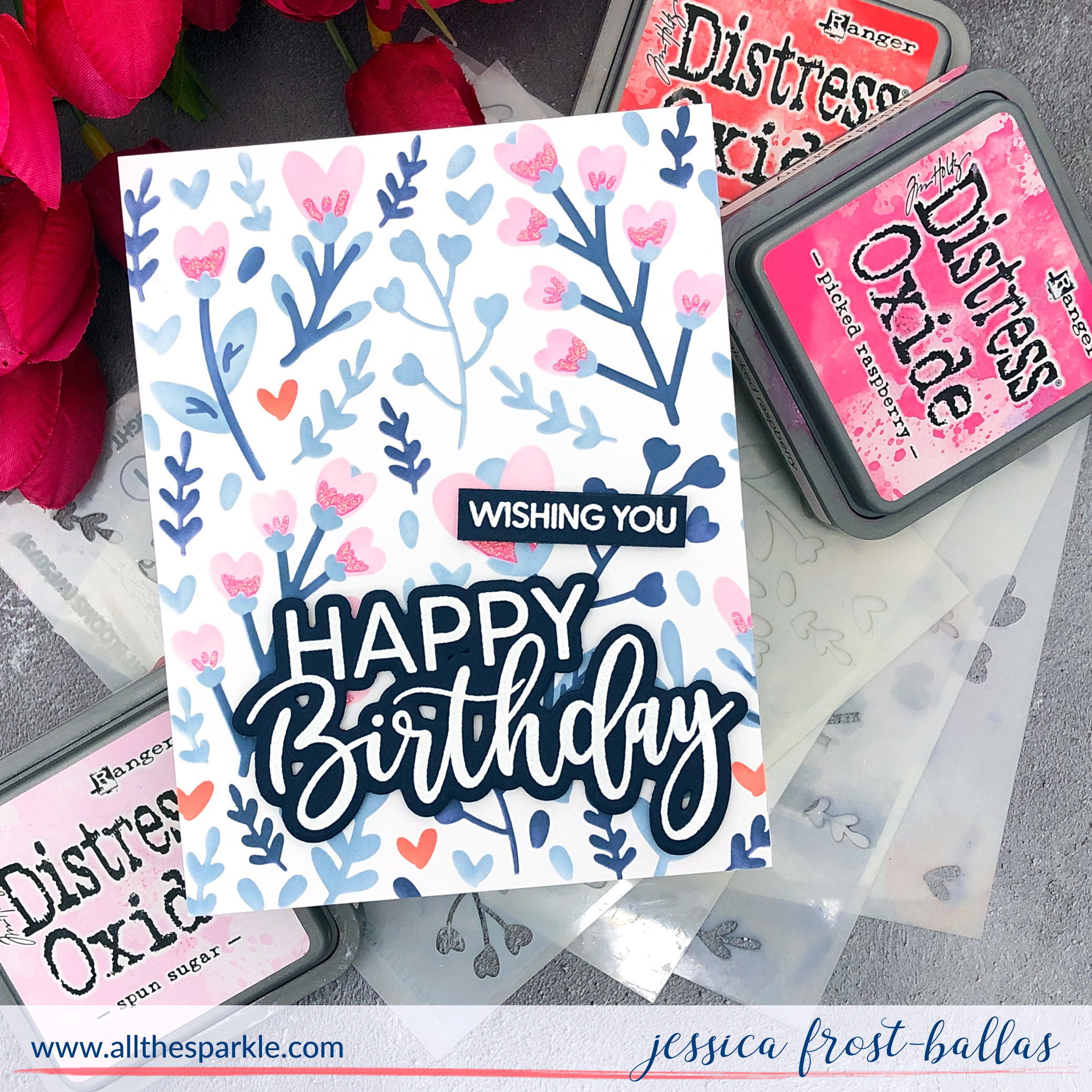This clever stencil set allows you to easily layer inks to create a pretty floral pattern! I used stormy sky, chipped sapphire, spun sugar, picked raspberry, and abandoned coral distress oxide inks to ink the stencil. After it dried I added a layer of moonstone glimmer paste to the top layer to add a little shimmer and sparkle to my flowers.