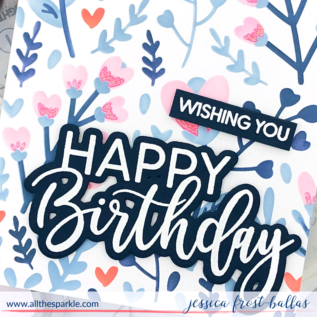 I set it aside to dry completely while I stamped the sentiment from the new Happy Birthday set. I love how the set has two big happy birthday sentiments in a variety of fonts and then lots of little messages to build a bigger sentiment! I stamped mine with versamark on navy cardstock and heat-embossed it with white embossing powder. Then I used the coordinating die for the large sentiment and trimmed down the smaller sentiment to a thin label. I popped those up with foam tape and that was it! These stencils make creating cards super quick and easy and you could do all sorts of color combinations to make different sets of cards!