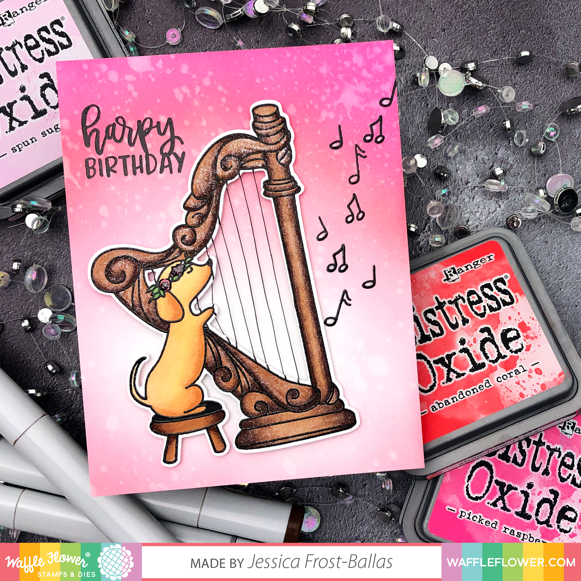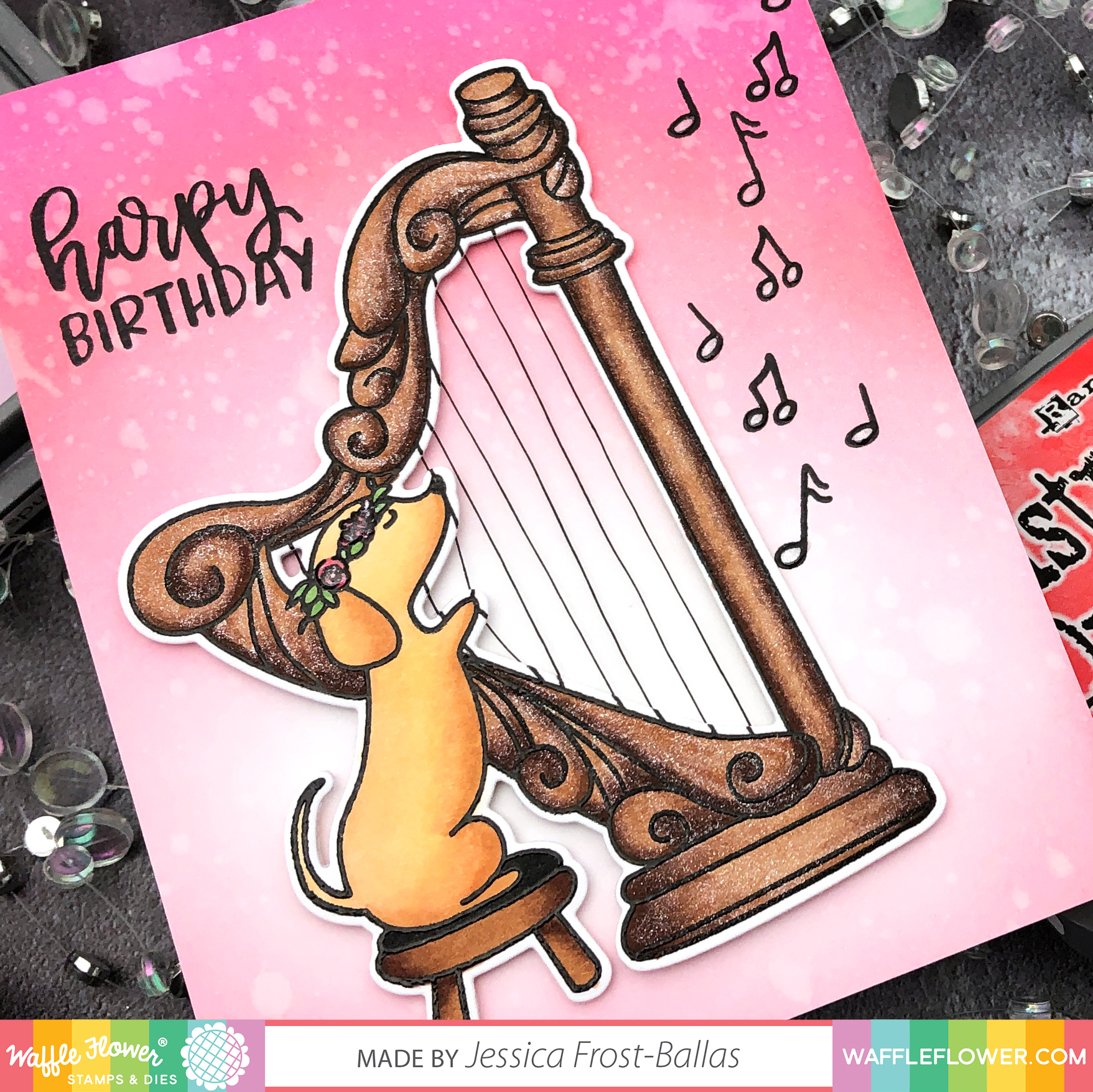 Next I blended a panel of spun sugar, worn lipstick, abandoned coral, and picked raspberry distress oxide ink. I splattered it with water and sprayed it with shimmer spray. Once it was dry I stamped my sentiment and music notes with versafine and heat-embossed them with clear embossing powder. I adhered my harp with foam mounting tape and then liberally coated the harp and music notes with spectrum noir clear sparkle. Finally I added a little crystal glaze to the music notes and floral wreath to finish the card! If you watch the video you’ll see a quick photo of my personal harp which closely resembles the coloring I chose for this card! 😉