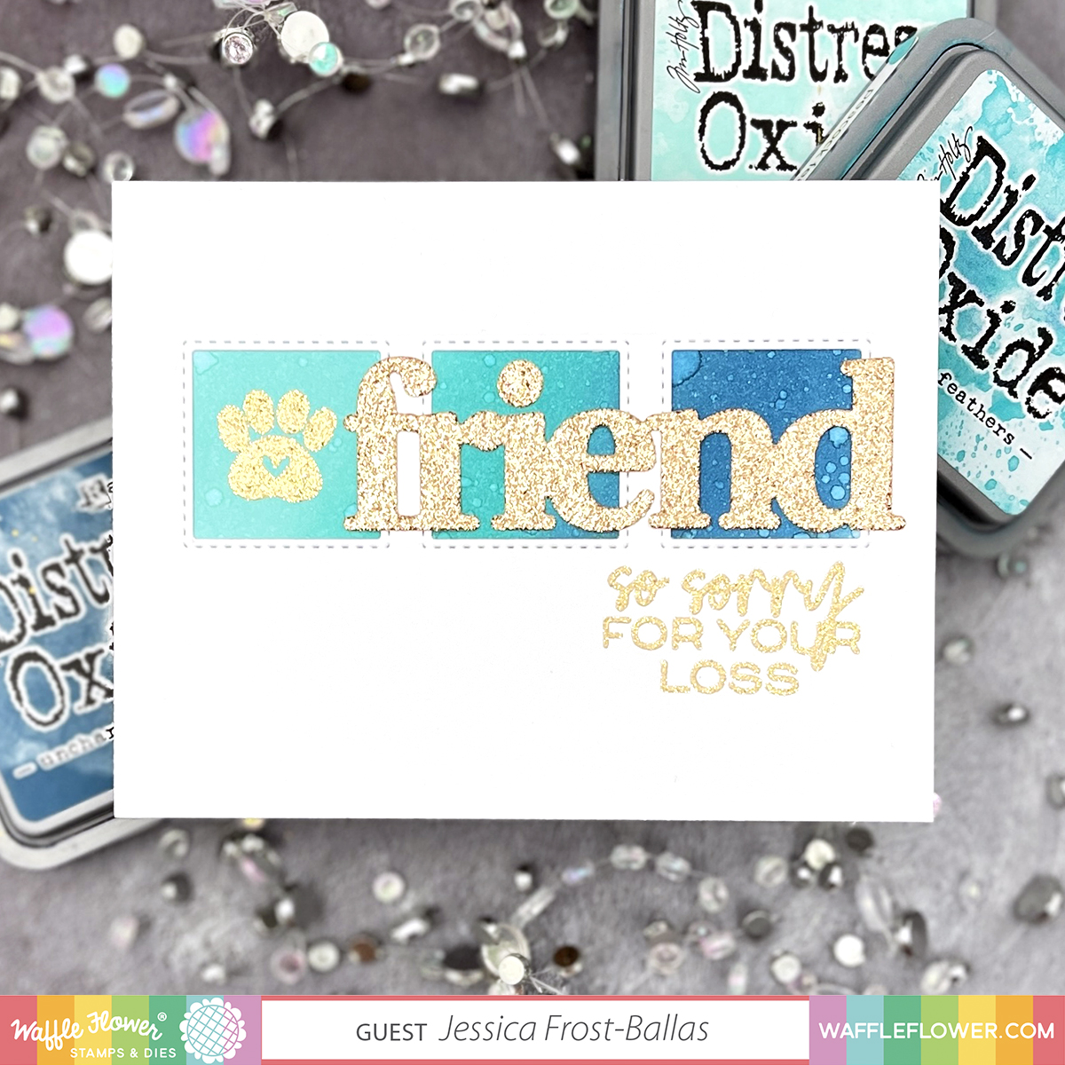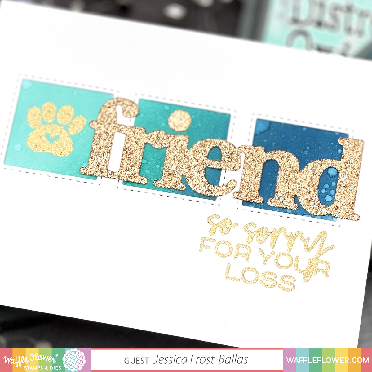 I stamped the heart pawprint from Pawfect Sentiments onto the blended panel and a sentiment onto the white cardstock and heat-embossed them with gold glitter embossing powder.  Finally I finished the card by die-cutting the Over-sized Friend from gold glitter cardstock.