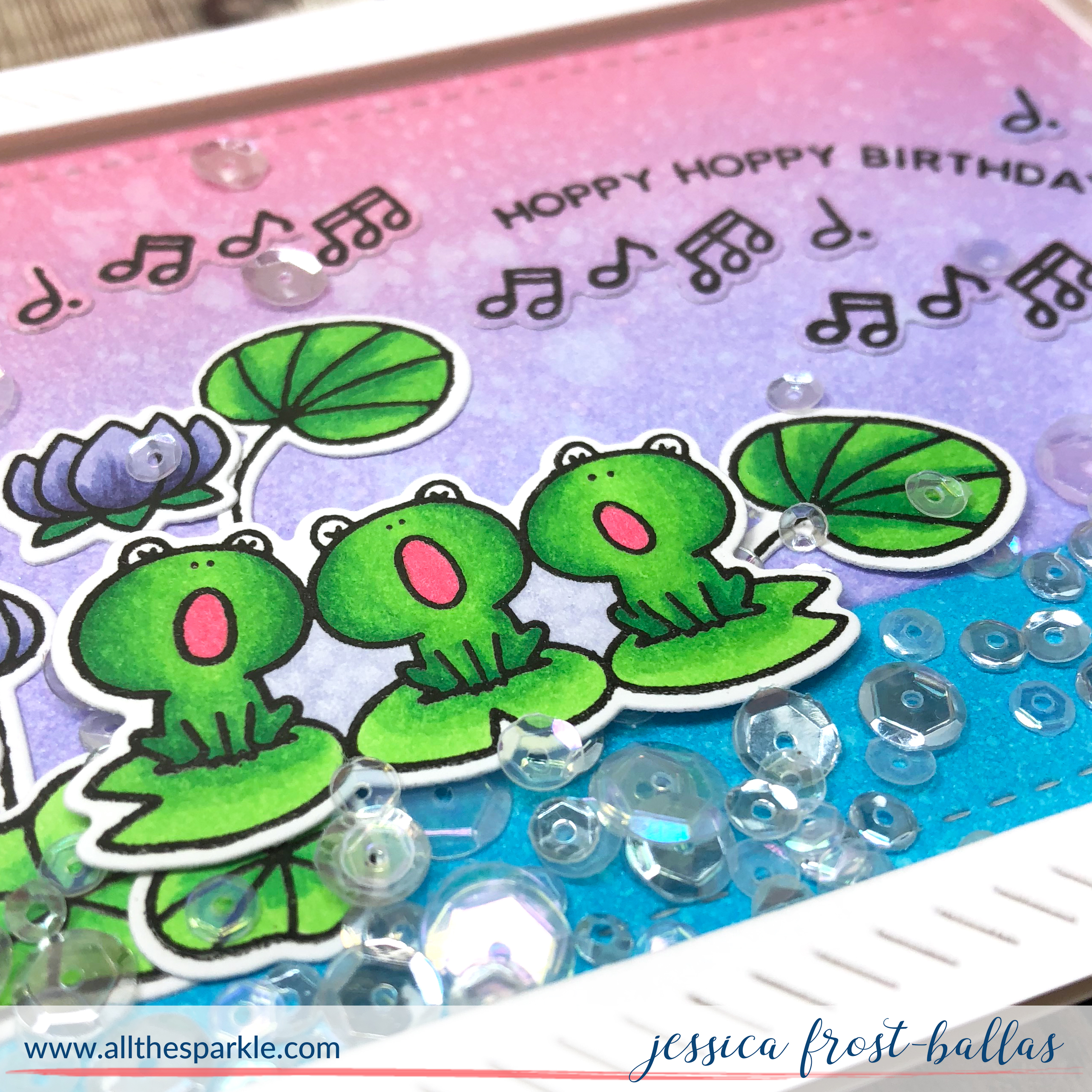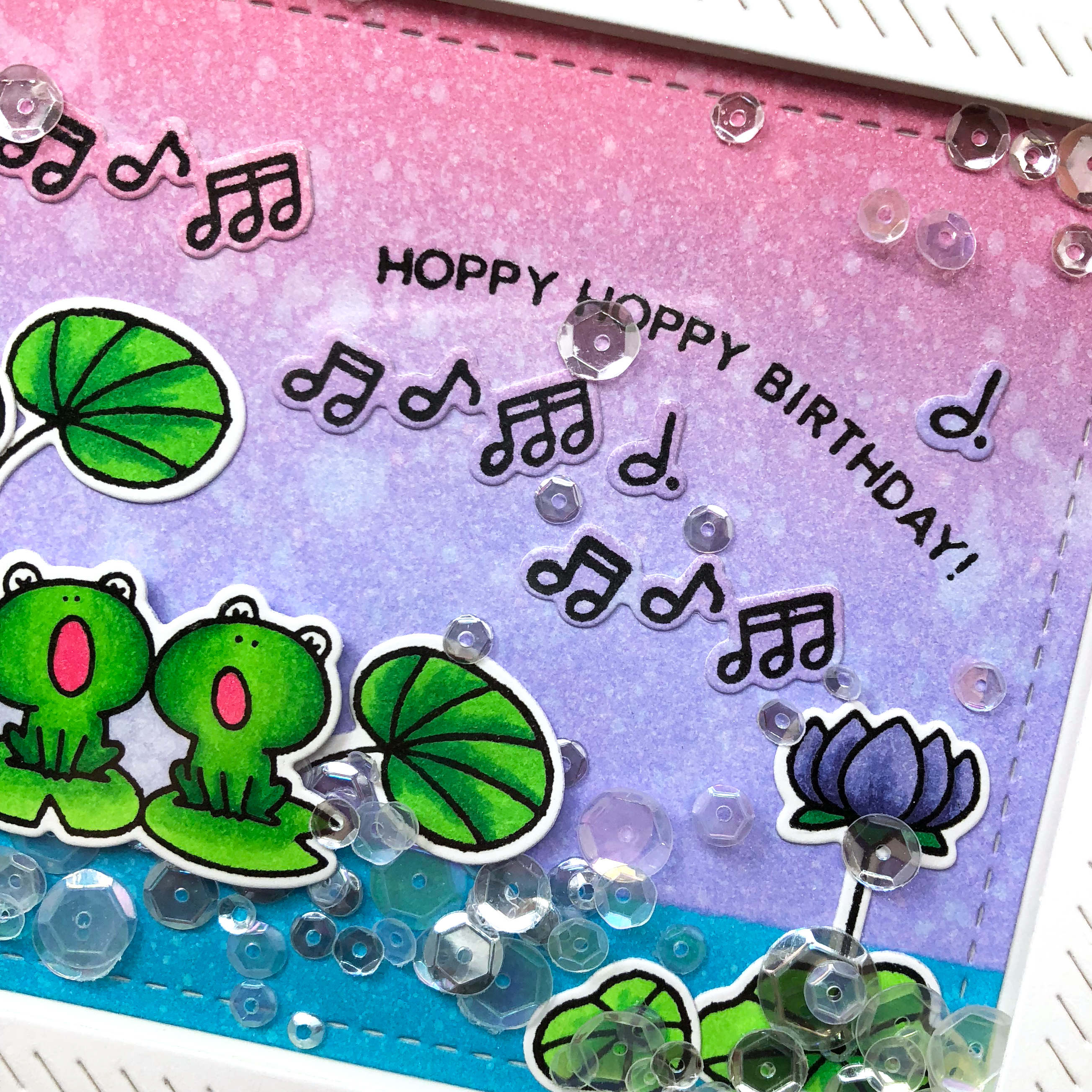 I curved the sentiment on the lid of my MISTI and stamped it onto the background with versafine and then heat-embossed it with clear embossing powder. Then I arranged my scene using foam mounting tape for my frogs and regular ATG adhesive for the rest of the images. I adhered a few iridescent clear sequins to the panel so that they’d always be a little higher even if the shaker sequins have settled to the bottom of the card.