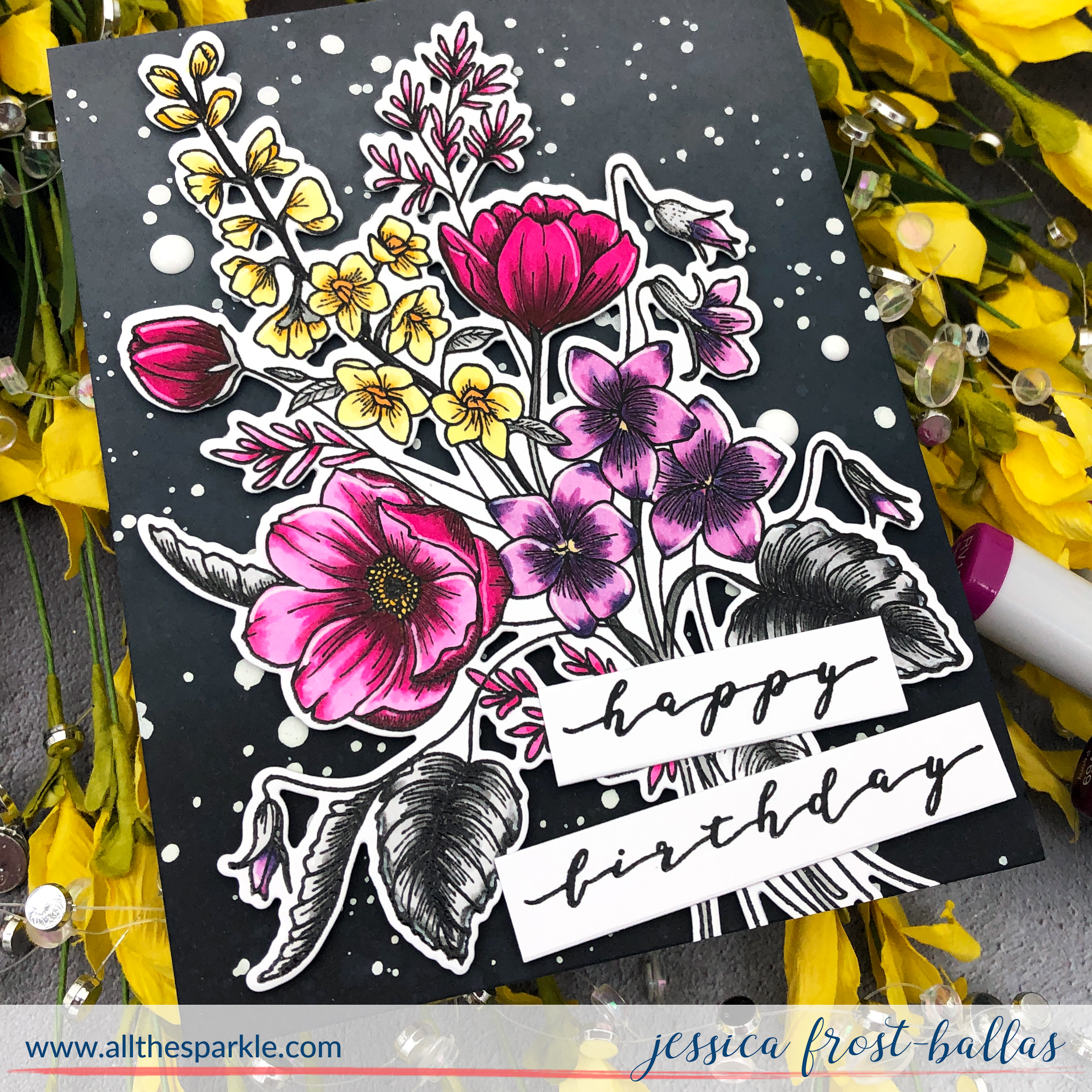 I am just head over heels for the gorgeous Bouquet Builder 3 set! The main arrangement is just breathtaking and the extra flowers are perfect for adding to the arrangement! I stamped the bouquet onto white cardstock with versafine and heat-embossed it with clear embossing powder before coloring it with copic markers. I used a variety of pinky-purples and yellows for the flowers and greys for the foliage. I love using neutrals for the “greenery” to allow the flowers to pop! I die-cut the arrangement with the coordinating dies and then added a few accents with a white gel pen.