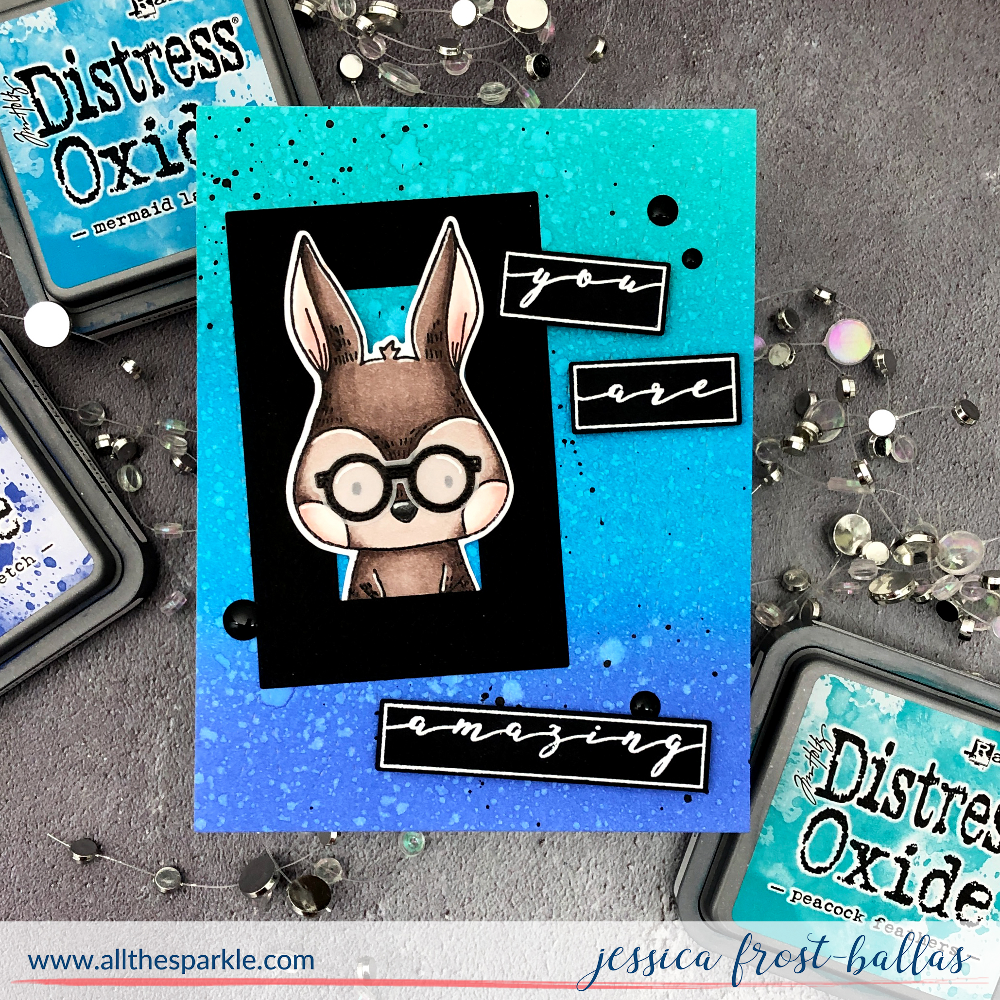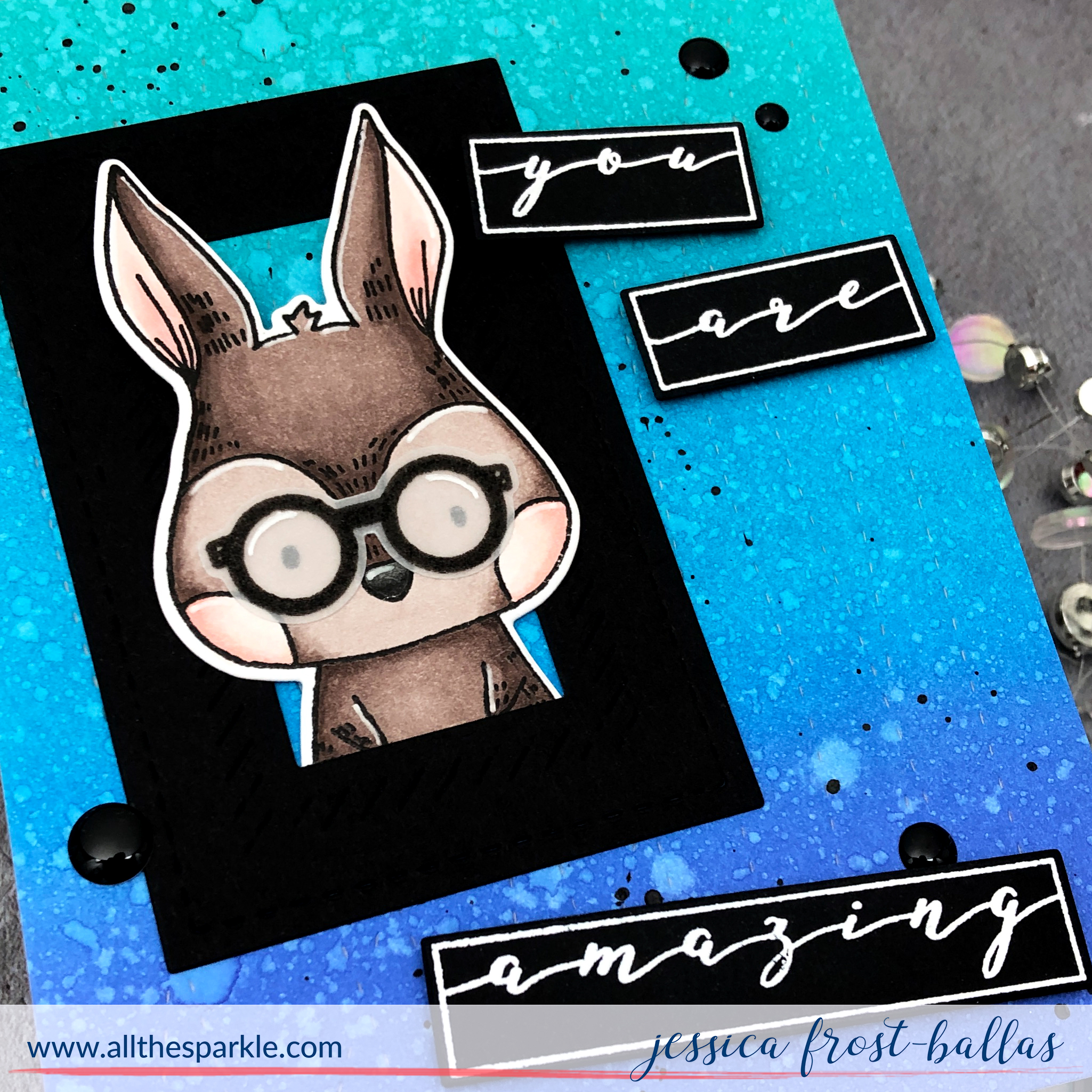I went in a very different direction for my second card using the cute Be Him critters! 😉 I stamped the bunny onto white cardstock with versafine and heat-embossed him with clear embossing powder before coloring him with copic markers. I die-cut him with the coordinating dies and added a few accents with a white gel pen. Then I blended a panel of strathmore bristol cardstock with peacock feathers, mermaid lagoon, and blueprint sketch distress oxide ink. I splattered the panel with water and then added black splatters on a diagonal from the top left to bottom right. I set that aside to dry while I worked on the rest of the card.