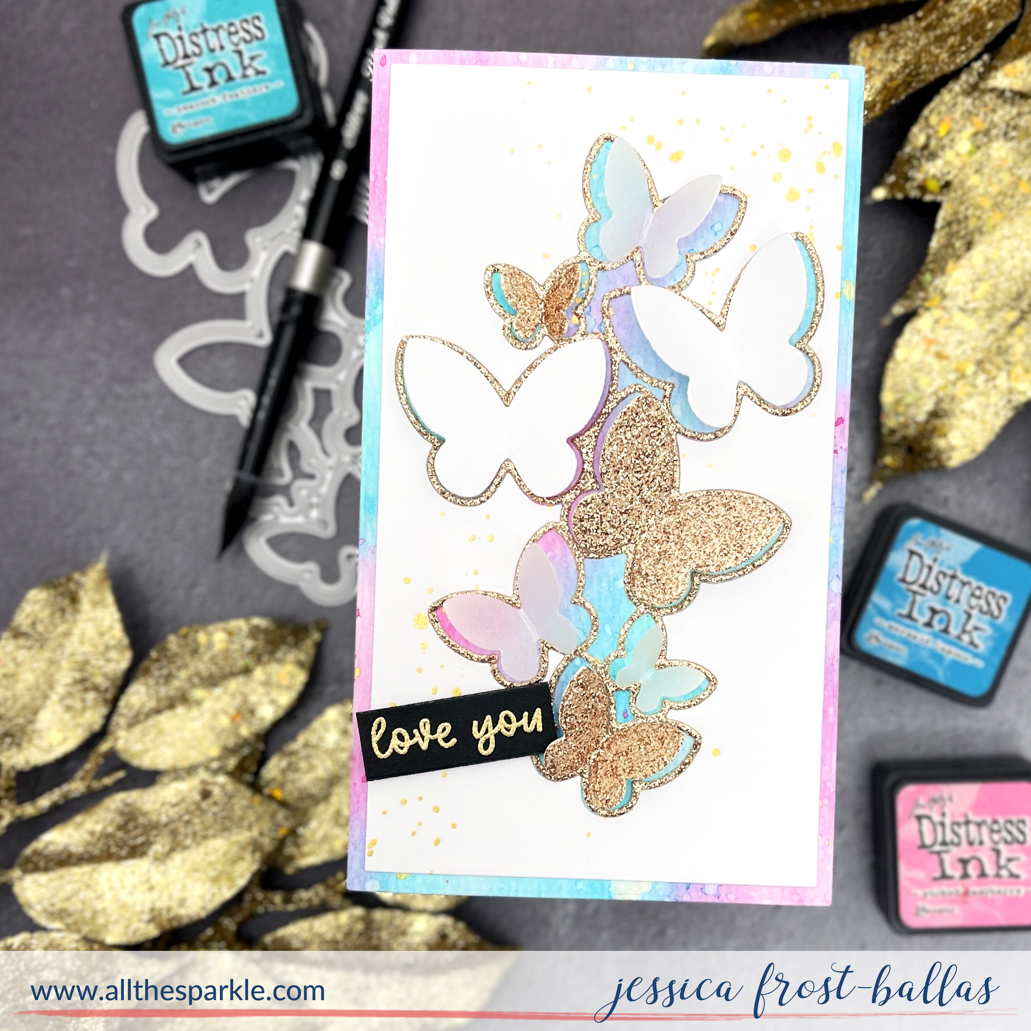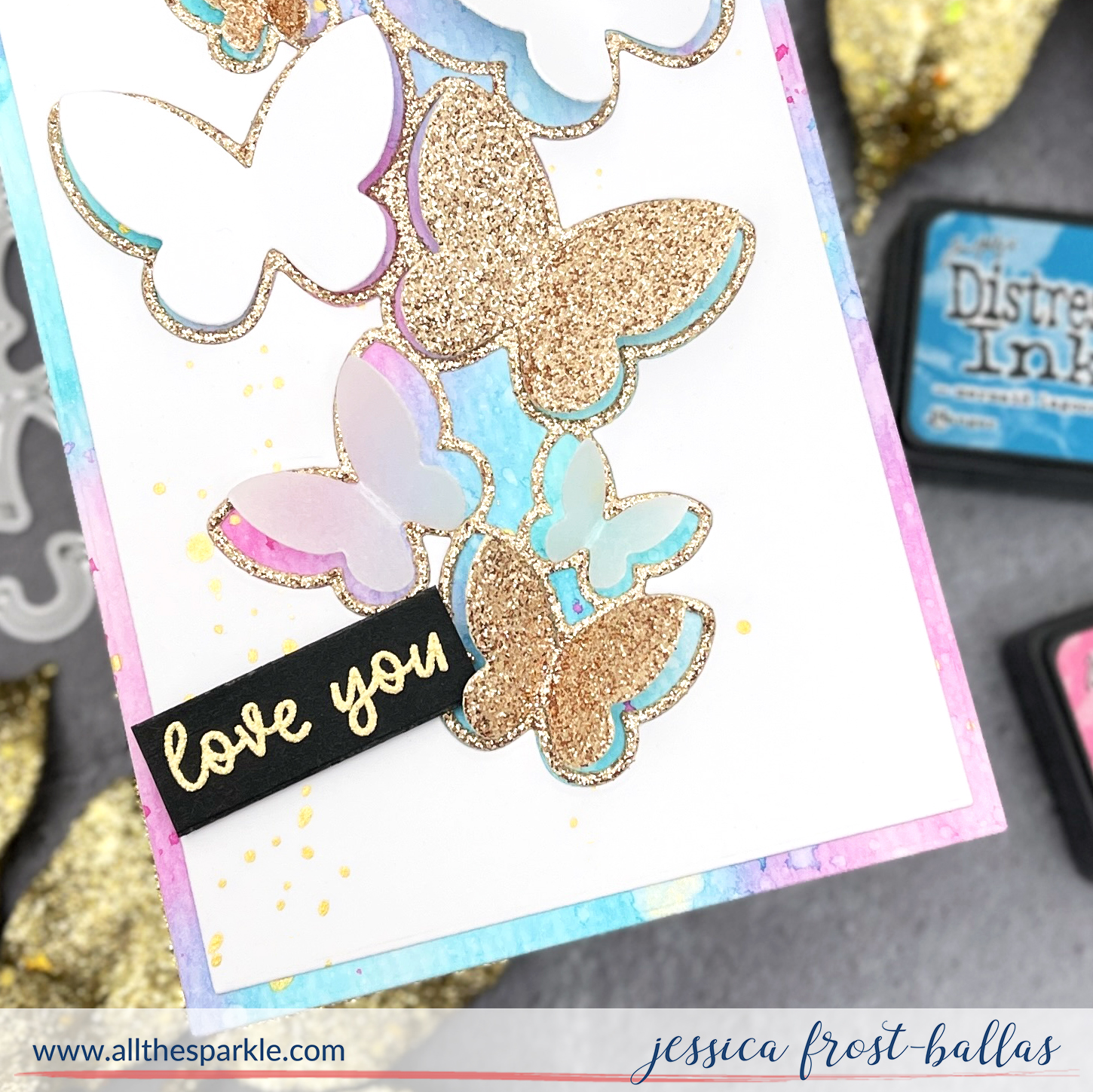 Next I adhered the white cardstock to my watercolored background. I die-cut the Flying Butterflies die from gold glitter cardstock and vellum so I adhered the gold glitter cardstock outline to the panel and then added a random assortment of butterflies. I folded them in half and then used a thin strip of adhesive to adhere each butterfly to the watercolor background. I love how you see peeks of the colorful background around the butterfly wings! To finish the card I added a sentiment from Jar Sentiments stamped on black cardstock and heat-embossed with gold embossing powder!