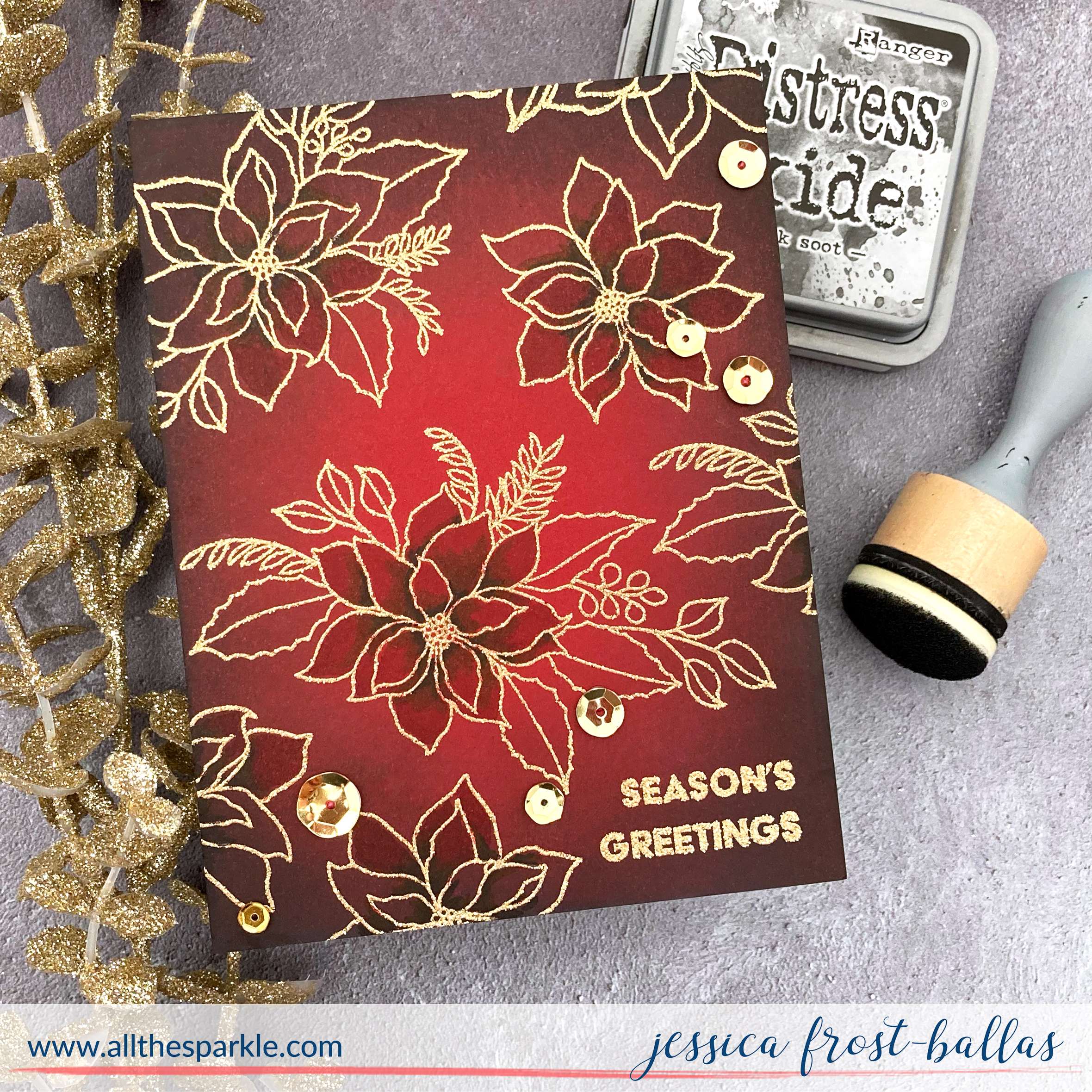 To start I took a piece of red cardstock and blended black soot distress oxide ink around the edges keeping it lighter towards the center of the panel. I let it dry completely and then stamped the sentiment and poinsettias randomly across the panel with versamark and heat-embossed them with gold tinsel embossing powder.