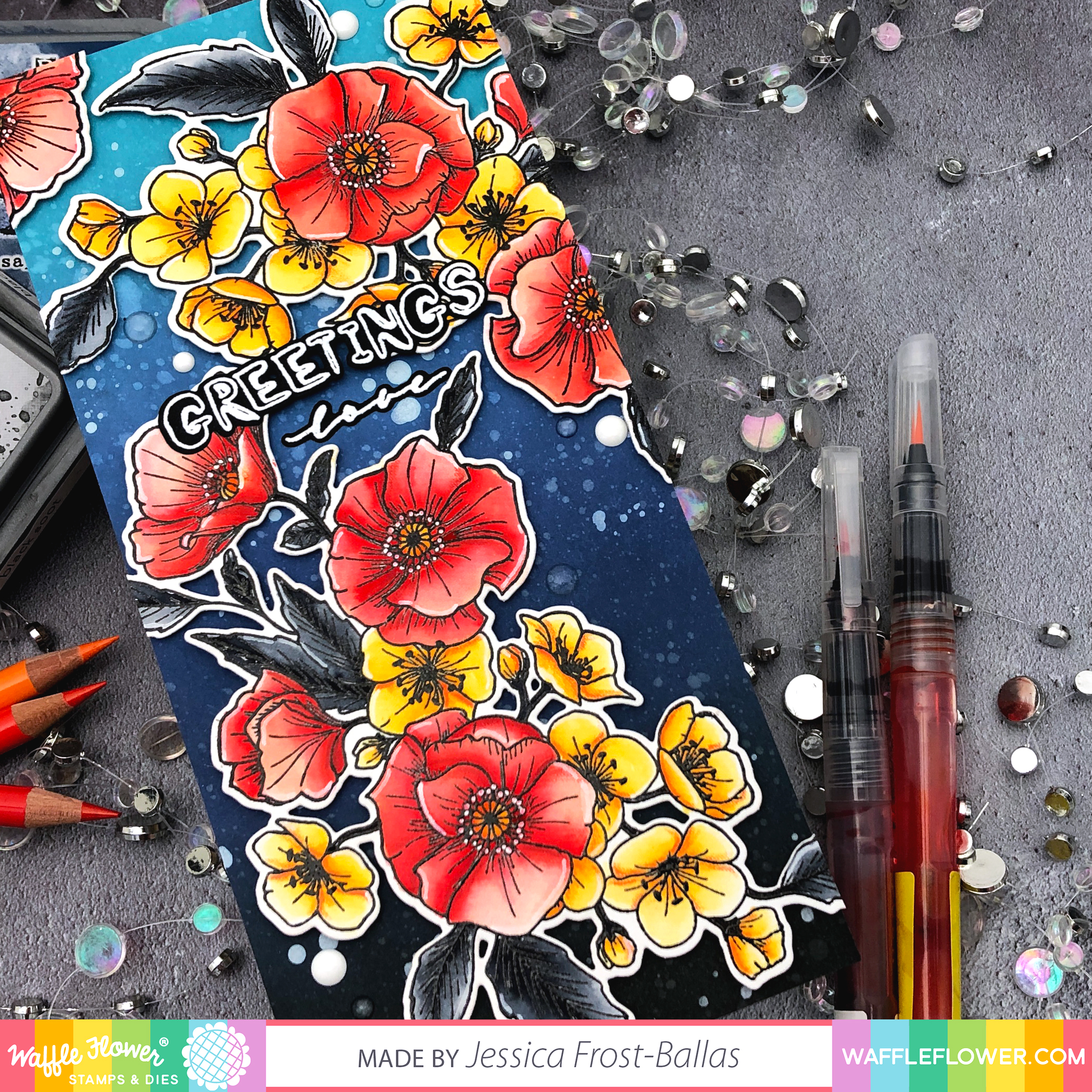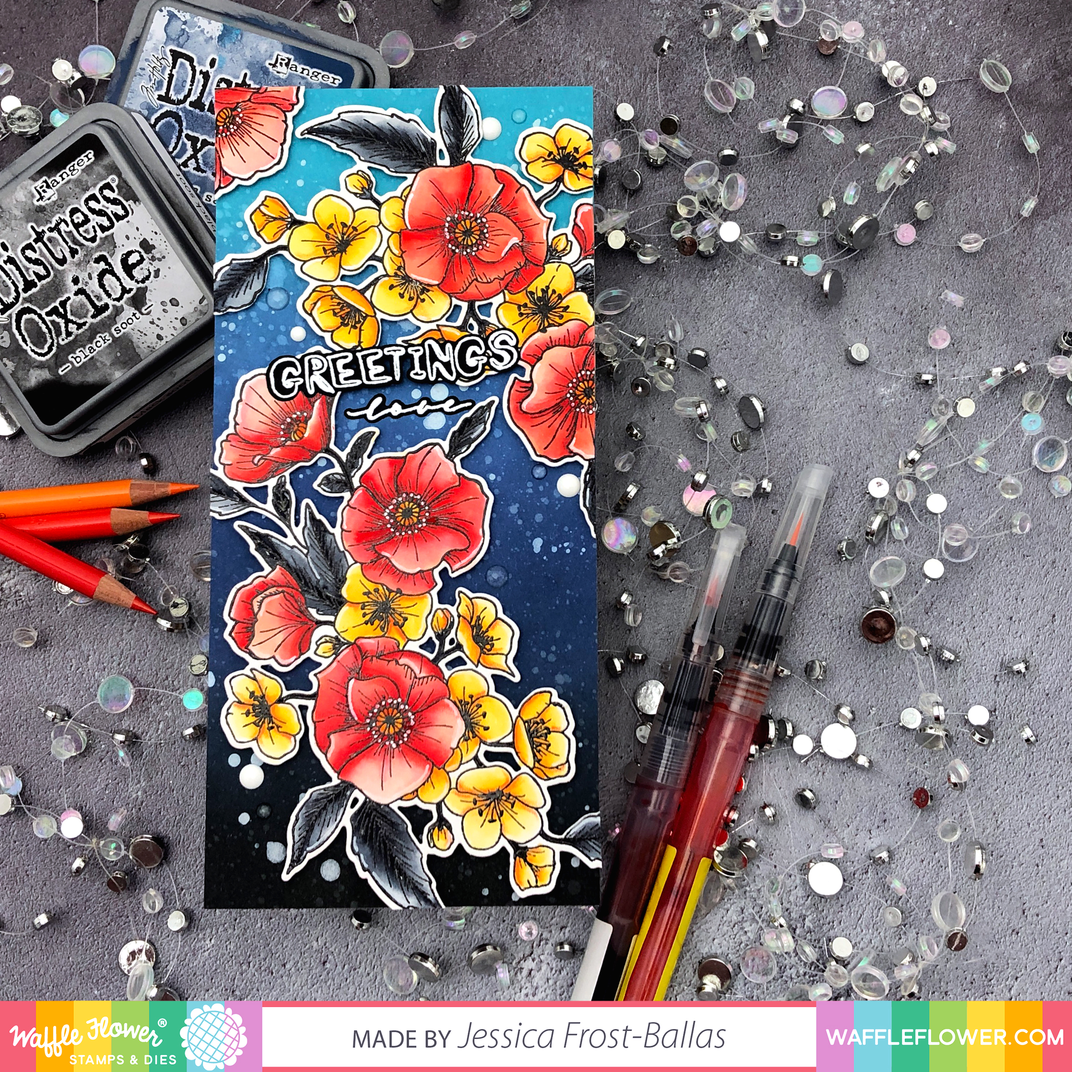 Good morning! I am so excited to be a stop on the hop celebrating the fantastic September release from Waffle Flower!! Today I’m sharing a slimline watercolored card using the stunning Poppy Hawthorn stamp set!!