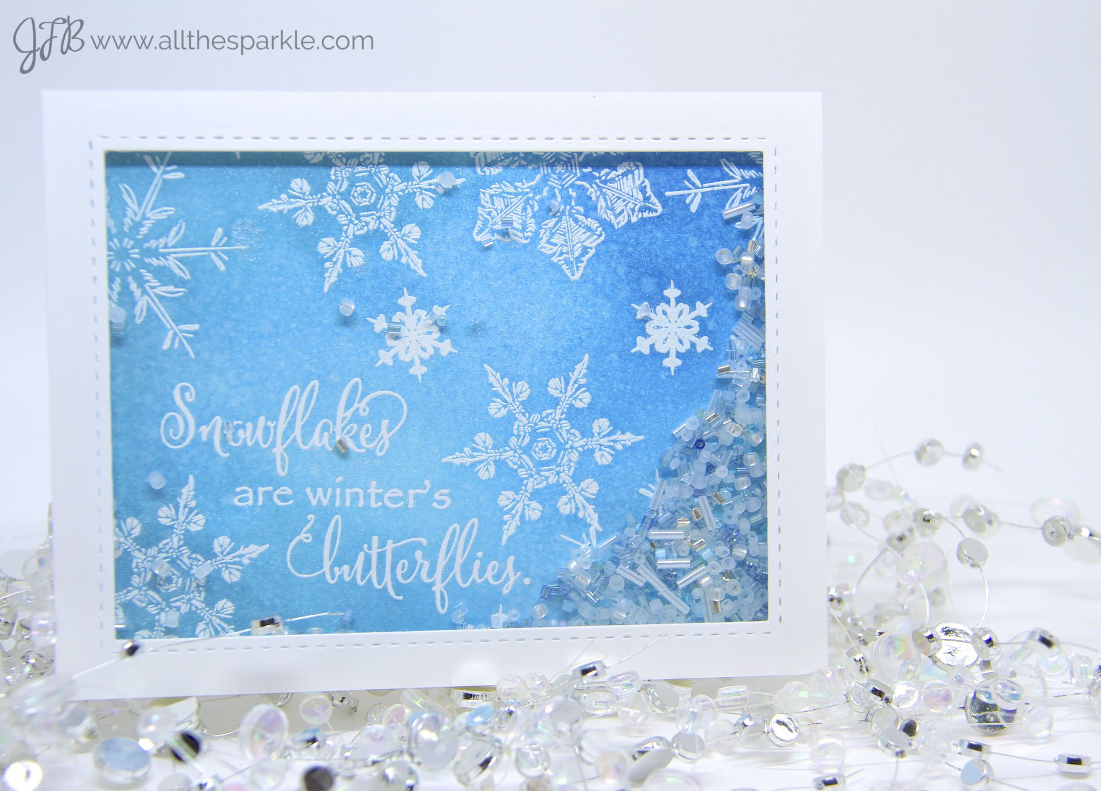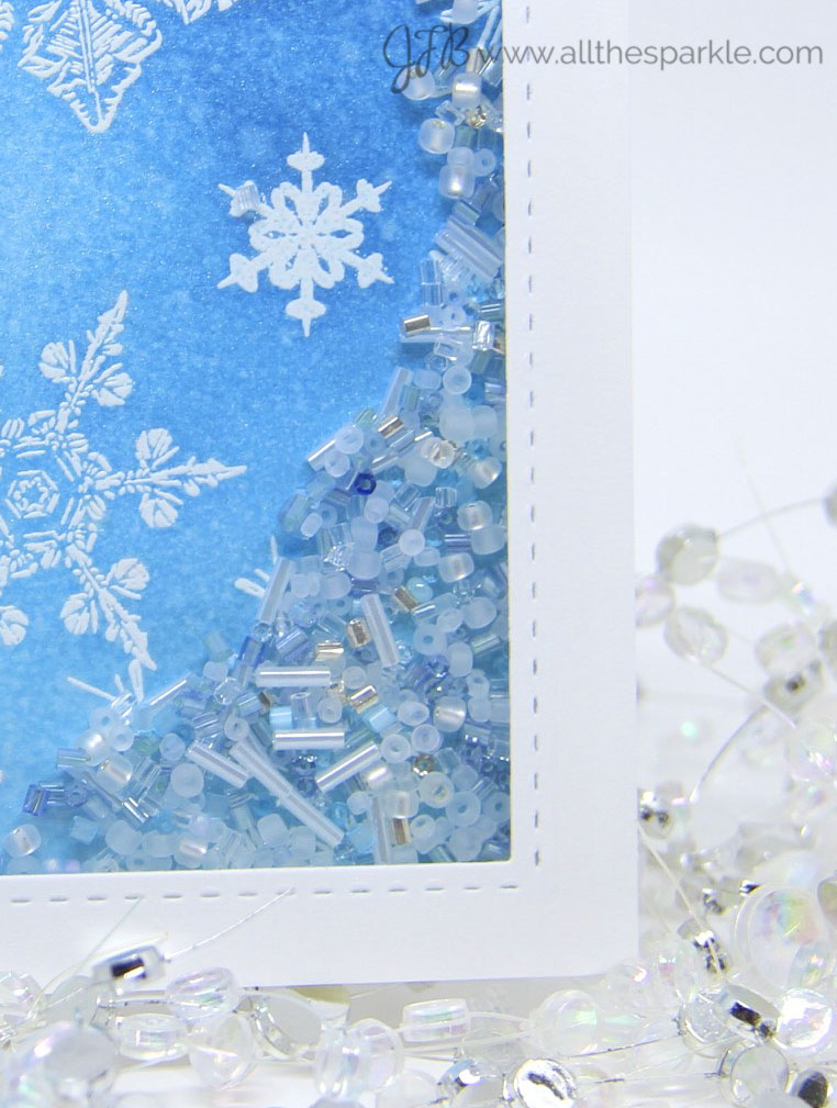 I heat-embossed the sentiment from So Suzy Stamps and snowflakes from The Ton with white embossing powder and then blended on distress inks in broken china, mermaid lagoon, and tumbled glass. I also added flecks of water and lots of iridescent medium for extra sparkle and shimmer. Finally I added the Fresh Snow and Elsa’s Dress couture mixes from The Ton to create my shaker! Here’s a close up look at those sparkly beads!