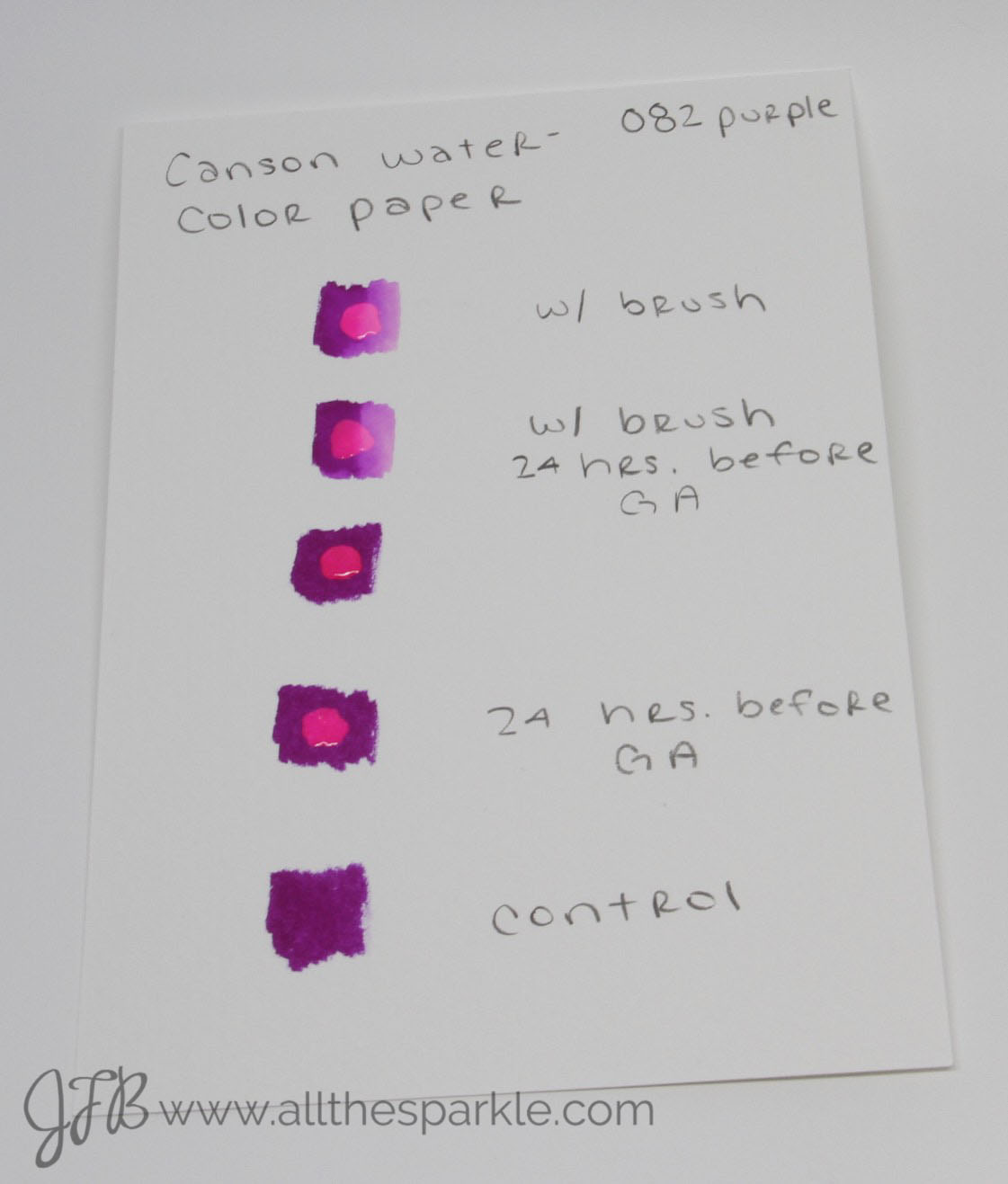 But just to double-check my theory, I scribbled the 082 Purple pen onto Tim Holtz watercolor paper, Canson watercolor paper, and Strathmore Bristol paper and did a little experiment. For two samples I scribbled a little of the pen on the paper and then used a water brush to blend it out a bit…for the other two I just scribbled the pen directly on the paper. On one of each sample I waited until the water was dry to the touch (about 30 minutes) and then applied a dot of glossy accents. On the other samples I waited a full 24 hours and then applied a dot of glossy accents. The bottom sample has not been altered in any way. As you can see, it didn’t matter how long I waited, the glossy accents totally discolored the sample.